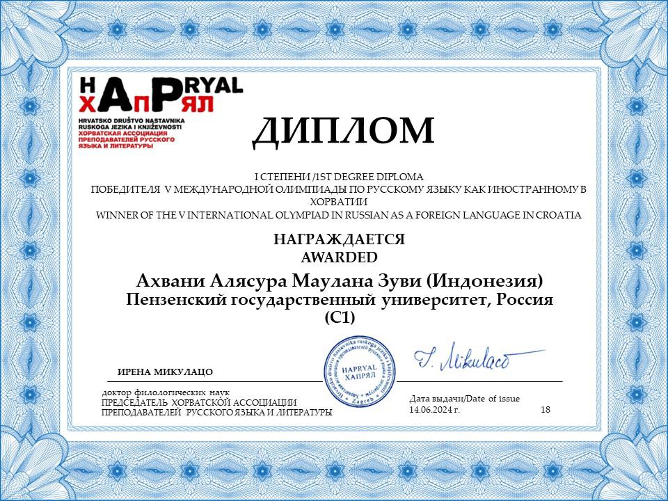 14 июня 2024 г. студенты кафедры РКИ приняли участие в V Международной Олимпиаде по русскому языку как иностранному, прошедшей в Хорватии. Олимпиада проводится с целью формирования и укрепления интереса учащихся к углублённому изучению русского языка и русской культуры.